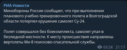В Волгоградской области россии разбился военный самолет Су-24. На борту были два члена экипажа и пока не ясно, успели они катапультироваться или погибли.