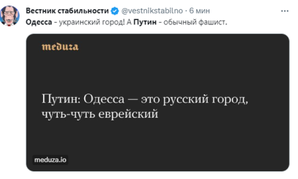 Еще один перл российского "лидера" — высказывание об Одессе. Он заявил, якобы чей это город.