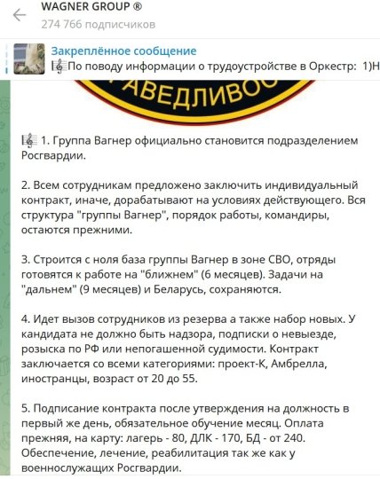 "Всех сотрудников попросили заключить индивидуальный контракт, иначе они будут дорабатывать на нынешних условиях. Вся структура группы "Вагнер", порядок работы, командиры остаются такими же", – говорится в сообщении.