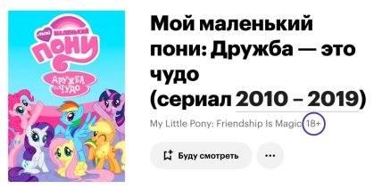 В россии детскому мультику "Мой маленький пони" поставили рейтинг 18+. Такая пометка появилась в онлай-кинотеатре "Кинопоиск", заблокированном в Украине.