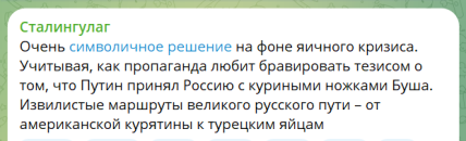 "Учитывая, как пропаганда любит бравировать тезисом о том, что Путин принял Россию с куриными ножками Буша. Извилистые маршруты великого русского пути – от американской курятины к турецким яйцам", — пишут в сети.