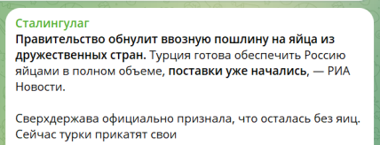 В сети иронизируют, что "сверхдержава официально признала, что осталась без яиц. Сейчас турки прикатят свои". Отмечается, что решение обнулить ввозную пошлину на яйца — очень символично.