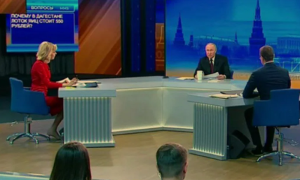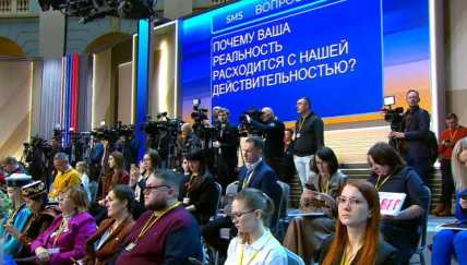Еще одна фраза, которая высвечивается прямо за спиной Путина на экране, звучала так: "Здравствуйте. Как можно переехать в Россию, про которую рассказывают по Первому каналу?". Не секрет, что по российскому телевидению день за днем продолжают вещать, что в стране дела идут хорошо и проблем совершенно нет.