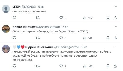 Пользователи сети сразу отреагировали на заявление российского президента: "Старые песни о главном"; "Он и про первую обещал, что не будет (8 марта 2022)"; "Пенсионный возраст не поднимут. Конституцию не поменяют. Войны с Украиной не будет. В войне будут принимать участие только контрактники."; "Ну так первую то никто и не заканчивал"; "Бегите, глупцы" и т.д.