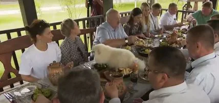 Белорусский диктатор александр лукашенко после совещания по вопросам сельского хозяйства устроил обед с чиновниками и посадил своего шпица Умку на стол.