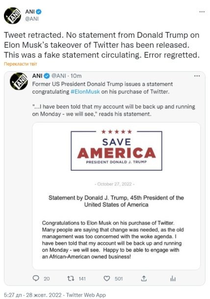 Кроме того, ранее в сети опубликовали якобы сообщения бывшего президента США Дональда Трампа, который сказал, что после покупки Маском Twitter его профиль будет восстановлен 31 октября после заблокирования еще в январе 2021 года. Такую информацию обнародовало издание ANI. Однако через некоторое время издание сообщило, что это фейк, и принесло извинения. Достоверной информации о возвращении Трампа в социальную сеть нет.