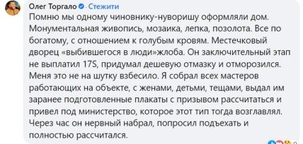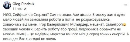 "В моей жизни очень мало людей, которые заказывали работы, а потом не рассчитывались, прячась от меня. Игорь Валерьевич! Миллиардер, меценат, филантроп-хороший человек! Верните работу или деньги. Художников обижать нельзя. Художники – это медиумы, маркеры вашего места среди тонких энергий. А оно для Вас сегодня не очень", — написал в сердцах художник.