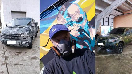 - На одну легковую машину уходит около 10 аэрозольных баллончиков краски для граффити, на бус — 15-17, — рассказывает "Телеграфу" 36-летний Сергей Новоселов, снимая защитную маску. — Эти краски хорошо держатся на металле. Их закупают благотворители, а моя задача – сделать камуфляж. На это я трачу от трех до пяти часов в свои выходные. То есть все довольно быстро. Обычно к вечеру мне пригоняют машину, а утром забирают. Уже раскрасил таким образом три десятка автомобилей, преимущественно доставленных из-за границы. Все они разные, и любой по-своему интересен.