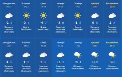 На выходные, 11 – 12 февраля, на фоне понижения атмосферного давления и активизации циклонической деятельности, в большинстве областей пройдёт снег, мокрый снег. Ночная температура воздуха повысится на 3 – 5 °С, днём сохранится в пределах -4…+1 °С.
