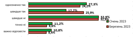 Также интересно, как изменились настроения украинцев после решения суда в Гааге: если в январе 2023 года 44,1% опрошенных украинцев говорили, что путин и лукашенко скорее смогут избежать ответственности, то в марте число таких уменьшилось до 41,5%.