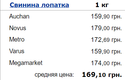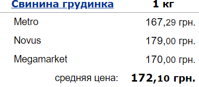 Свиная грудинка изменилась в цене со 168,13 до 172,10. Стоимость за последний месяц выросла на 4 гривны.