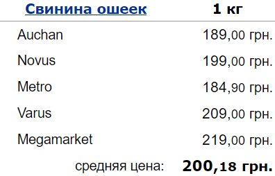 Свиной ошеек также стал дороже в период с февраля по март. Средняя цена на него сейчас 200,18. Отметим, что месяцем ранее его продавали по 192,04. То есть, стоимость продукта изменилась почти на 8 гривен.