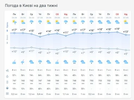 "Понедельник в Украине будет теплым! В течение дня +14+19 градусов! Но 24 апреля предполагаются дожди — периодические, от небольших до умеренных. Днем в понедельник, скорее, во второй половине дня, местами возможны грозы. Не пугайтесь, возьмите эту В Киеве завтра без существенных осадков, однако во второй половине дня понедельника есть вероятность небольшого дождя, возможно с грозой. В столице будет в понедельник тепло, до +18 градусов", — отмечает она в Сети.