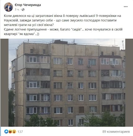 "Когда смотрю на эти зарешеченные окна 8 этажа львовской 9-этажки на Научной, всегда спрашиваю себя – что именно заставило хозяина поставить металлическую решетку на все свои окна? Единственное логическое предположение — может, много "сидел"… хочет чувствовать себя в своей квартире "как дома", — написал Егор Чечеринда.