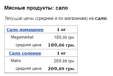 Более значительные изменения в цене на продукт произошли с соленым салом. В мае стоимость этого продукта составила 262,95 грн, а в июне в супермаркетах его продавали по 269,89. То есть, за последний месяц продукт подорожал на 6,94.