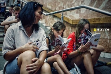 Кому-то тревога не помеха для работы или учебы — девушка, сидя на полу метро, продолжила что-то усердно делать в ноутбуке. А другие решили провести это время с пользой и почитать книги. Причем как маленькие, так и взрослые.