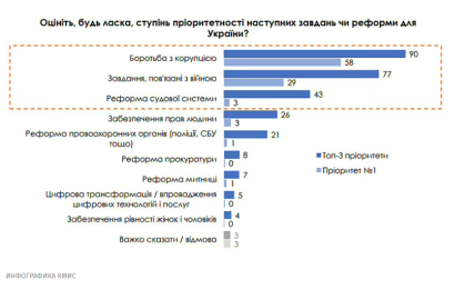 Украинцы выделяют несколько основных проблем, к которым страна должна найти решение. На первом месте задач и реформ оказалась борьба с коррупцией. Большинство считает, что антикоррупционная деятельность — это главная задача для Украины.