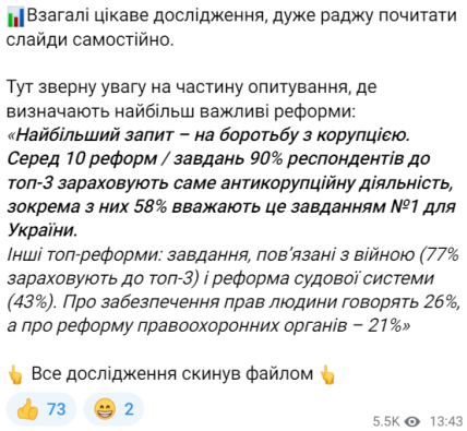 Результаты опроса в своем Telegram-канале прокомментировал народный депутат Украины Ярослав Железняк. Он обратил внимание на то, что это довольно интересная часть опроса, поскольку по ней можно увидеть запрос общества.