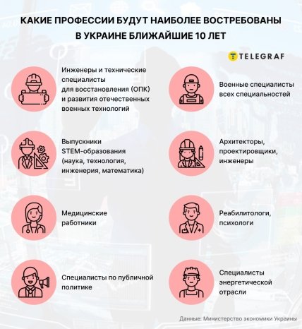 Кроме того, заместитель министра отметила, что в Украине потребуются медицинские работники, включая реабилитологов и психологов. Также будут востребованы специалисты энергетической отрасли, специалисты по публичной политике и специалисты строительной отрасли, в том числе архитекторы, проектировщики, инженеры.