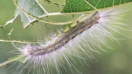 Речь идет о гусеницах американской белой бабочки, которые в четвертом возрасте образовывают крупные колонии на деревьях. Пораженное гусеницами растение можно определить по съеденной листве и густой паутине.