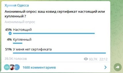 Администраторы популярного телеграм-канала "Ху**ая Одесса" решили поинтересоваться, сколько людей в городе предпочли купить свидетельство о вакцинации.