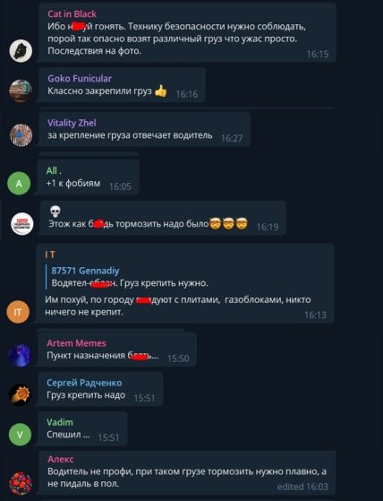 "Технику безопасности нужно соблюдать", "+1 к фобиям", "Водитель не профи, при таком грузе тормозить нужно плавно", "Это ж как тормозить надо было?", — среди прочего, пишут в комментариях.
