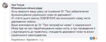 Следует заметить, что были и такие жители Южного, которые писали, что переименование города необходимо с учетом Закона Украины "Об обеспечении функционирования украинского языка как государственного".