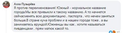 Эту инициативу вынесли на обсуждение общины, которая в свою очередь раскритиковала ее полностью. Жители города наперебой писали, что выступают "против" изменения названия Южного и отмечали, что не видят в этом никакой необходимости. Некоторые пытались давать советы властям, чем им лучше заниматься вместо переименования городов, а еще часть жаловалась, что придется менять кучу документов.