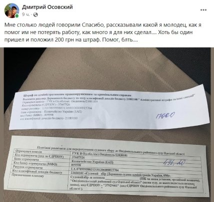 Также на своей странице в Facebook он удивился реакции горожан, которым помогал, что от них не было предложений хотя бы частично заплатить этот штраф: "Мне столько людей говорили "Спасибо", рассказывали какой я молодец, как я помог им не потерять работу, как многое я сделал для них… Хотя бы один пришел и положил 200 грн на штраф".