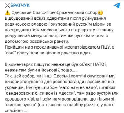 Председатель Общественного совета при Одесском ОВА Сергей Братчук опубликовал реакцию секретаря Одесской епархии ПЦУ отца Теодора Оробца на удар россиян по Спасо-Преображенскому собору.