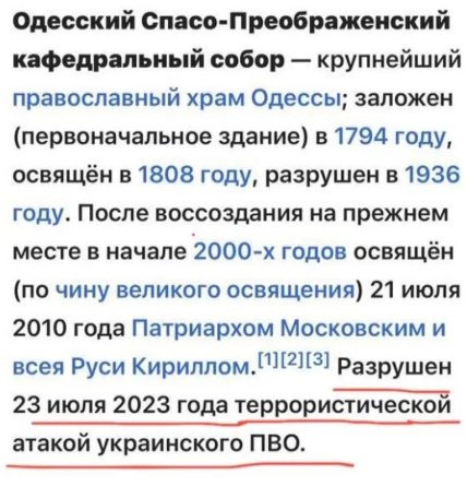 Примечательно, что в июне 2010 года Свято-Преображенский собор в Одессе посетил патриарх кирилл, а в июле 2023 он был уничтожен российскими ракетами, которые были "освящены" священнослужителями рф.