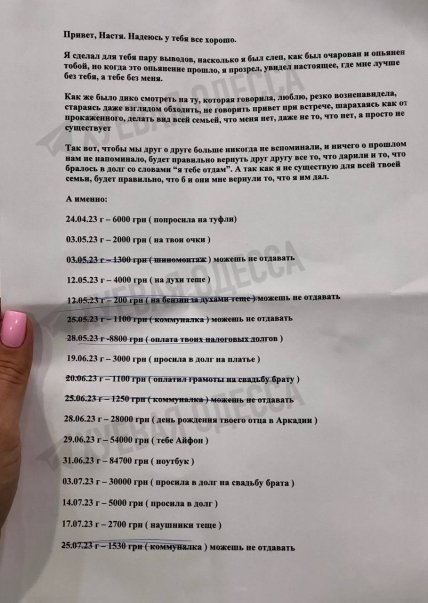Он просит вернуть ему почти 200 тысяч гривен, часть из которых бывшая возлюбленная брала в долг. Так, в списке перечислены следующие траты за период с 24 февраля 2023 года по 25 июля 2023 года: