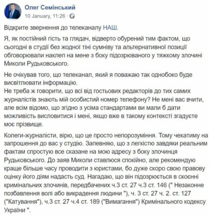 "В эфире продвигают ложные заявления, цель которых — создать вокруг моего имени негативный информационный фон. Не ожидал, что телеканал, гостем которого я часто бываю, будет выполнять подобный политический заказ. Тем более в интересах подозреваемого по тяжким уголовным делам Рудьковского. Напомню, что он подозревается в совершении преступлений, предусмотренных ч.3 ст.27 ч.3 ст.146 ("Незаконное лишение свободы или похищение человека"), ч. 3 ст. 27 ч. 2. ст. .3 статьи 27 ч.4 статьи 189 ("Требование") Уголовного кодекса Украины", — резюмировал член парламента.