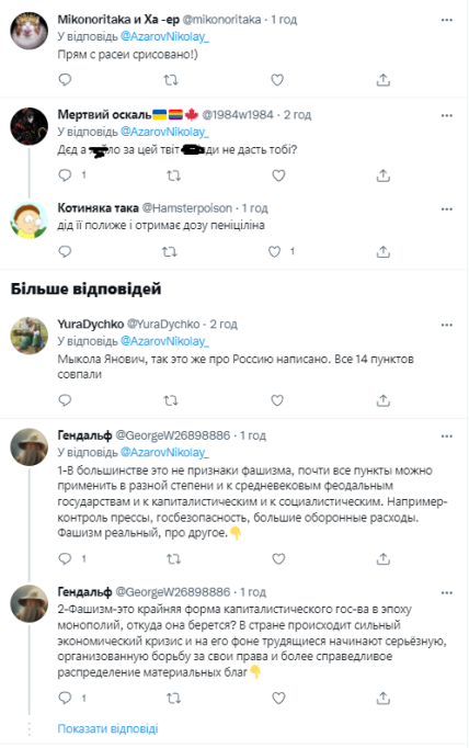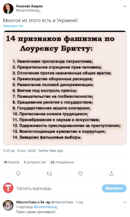 Однако интернет-пользователи подметили, что данные характеристики, сформулированные британским политологом Лоуренсом Бриттом, присущи отнюдь не Украине, а России. Причем, все 14: