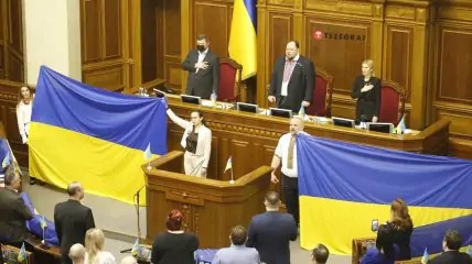 Как передает из зала заседаний корреспондент "Телеграфа", сегодняшнее утро в парламенте началось с гимна Украины. Флагов в Раде много, как никогда, а некоторые нардепы даже обернулись в них в знак единения.