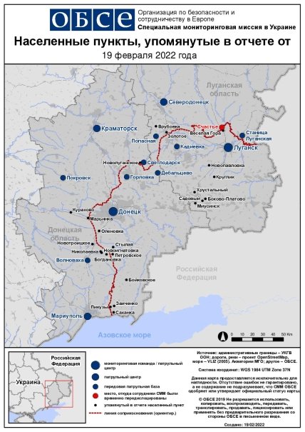 Ниже публикуем карту СММ ОБСЕ по нарушениям прекращения огня на Донбассе за 19 февраля, на которой видны ориентировочные границы территорий, которые ныне находятся под контролем российских формирований в пределах Донецкой и Луганской областей.