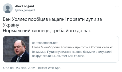 Глава Министерства обороны Великобритании заявил, что президент РФ Владимир Путин "пустился в полное безумие" в ситуации, которая сейчас сложилась вокруг украинского государства. Его речь вызвала большой шквал ненависти и обид в соцсетях со стороны российских пользователей.