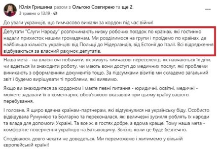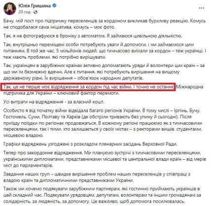 В пятницу, 6 мая, Юлия Гришина опубликовала пост в Facebook, где отметила, что это уже не первая ее заграничная командировка с начала войны.
