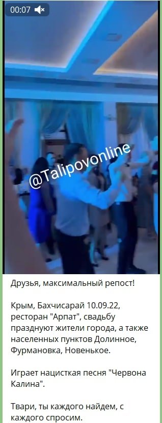 "Крым, Бахчисарай 10.09.22, ресторан "Арпат", свадьбу празднуют жители города, а также населенных пунктов Долинное, Фурмановка, Новенькое. Играет нацистская песня "Червона Калина". Животные, мы каждого найдем, с каждого спросим", — говорится в сообщении в одном из каналов.
