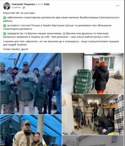 (Сообщение Тищенко от 2 апреля, где он говорит, что бронежилеты его жена и помощницы "буквально привезли в Украину на себе").