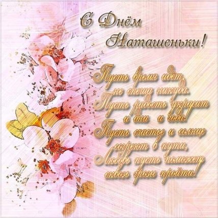 С днём ангела, милая Наташа. Пусть твой крылатый защитник укроет тебя от ненастной погоды, от ненужной грусти, от глупых идей, от дурных людей, от злых дней. Желаю тебе, Наташенька, быть всегда самим очарованием с душою, полной доброты и сердцем, вдохновляющим тебя любовью!