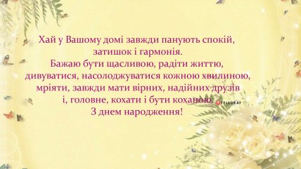 Поздравляю с днём рождения чудесную и добрую, очень красивую и отзывчивую женщину. Пусть судьба излучает яркий свет счастья и любви, пусть жизнь состоит из ярких воспоминаний, весёлых идей и захватывающих историй, пусть любое поле деятельности радует успехом, а близкие люди пусть дарят душевную теплоту и поддержку.
