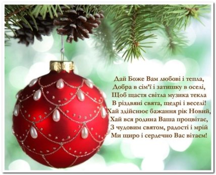 Вітаю з Новим роком! Бажаю, щоб наступний рік приніс нам стільки радості, скільки днів у році, і щоб кожен день дарував нам усмішку і частинку добра. Нехай все, що ми планували, обов'язково збудеться, все, що хотіли почати, – почнеться, а що хотіли закінчити – закінчиться. Нехай у наступному році ми всі станемо щасливішими, добрішими і уважнішими до людей, які нас оточують, а світ відкриє нам нові двері!