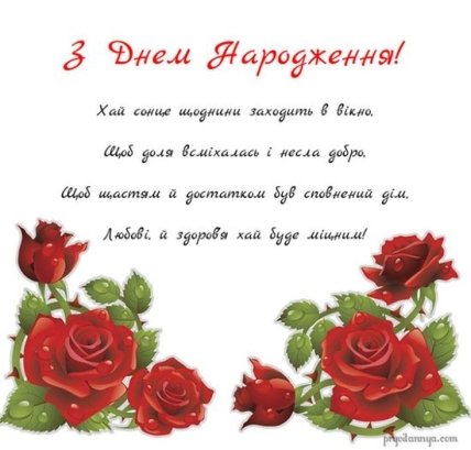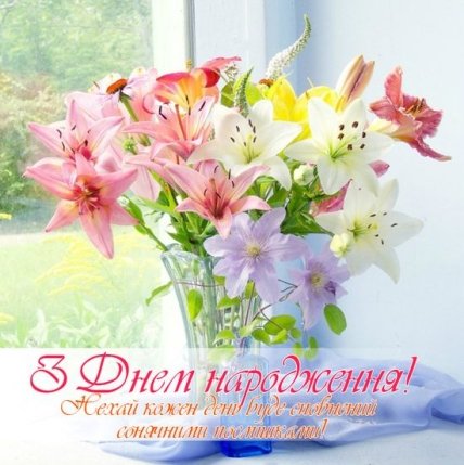 В радісний і світлий День народження хочу побажати щасливого сьогодні і радісного завтра, красивих мрій і їх здійснення! Хай кожен день повниться веселим і милим відчуттям, гарним настроєм, душевними зустрічами і плідною працею! Щастя і радощів у домівку, здоров’я і благополуччя родині, натхнення і творчості для душі! Хай сонце заглядає у вікна, а щастя в серце!
