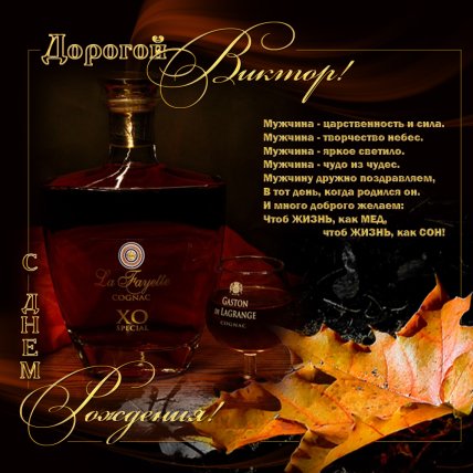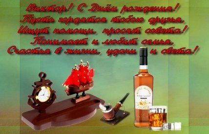 Виктор! Ты победитель по жизни. Пускай тебе, всегда сопутствует успех. Желаю новых побед, а в придачу, настоящей любви и огромного счастья. Никогда не печалься, по пустякам не огорчайся. Желаю всегда чувствовать под ногами надежную и твердую опору. Желаю всегда идти по жизни с улыбкой, под покровительством самой счастливой звезды. С праздником!