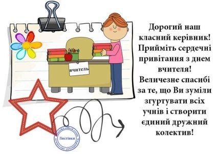 Наша дорога класна керівниця, щиро вітаємо Вас з Вашим професійним святом – днем вчителя. Ви для нас справжнє джерело світла. Нехай свято подарує Вам відмінний настрій. Нехай неодмінно збудеться Ваша заповітна мрія. Хай Вам щастить у всьому, завжди. Бажаємо добробуту, міцного здоров'я, достатку в домі. Нехай те добро, яке Ви віддаєте учням, обов'язково повернеться сторицею до Вас. Будьте щасливі, всіх Вам благ, нехай щаслива зірка освітлює Ваш шлях.