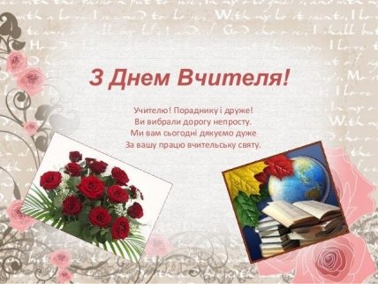 Вітаю зі Всесвітнім днем вчителя та хочу побажати впевненості, витримки, міцного здоров’я та міцних сил. Нехай Ваша любов до життя, до своєї роботи, до всього світу буде без меж, нехай Ваші учні будуть слухняними та спроможними на великі перемоги, нехай Ваше серце зустрічає кожен день з доброю надією, нехай Ваша душа з кожною миттю познає смак щастя.
