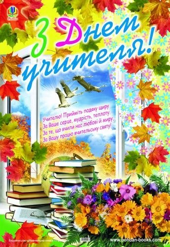Вітаю з Днем вчителя! Бажаю бути поважною особою у школі, щасливою людиною в житті! Бажаю з кожним своїм уроком дарувати учням міцні знання, веселі мрії, бажаю з кожною хвилиною життя дарувати своєму серцю радість, щиру любов!