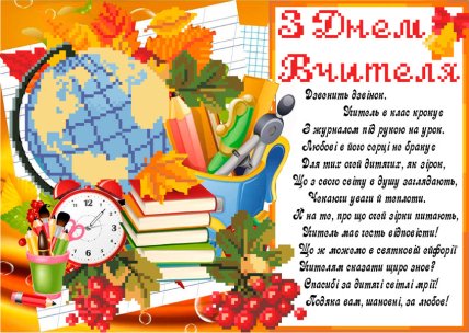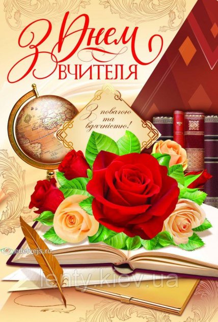 Вітаю зі Всесвітнім днем вчителя та хочу побажати впевненості, витримки, міцного здоров’я та міцних сил. Нехай Ваша любов до життя, до своєї роботи, до всього світу буде без меж, нехай Ваші учні будуть слухняними та спроможними на великі перемоги, нехай Ваше серце зустрічає кожен день з доброю надією, нехай Ваша душа з кожною миттю познає смак щастя.