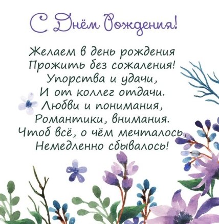 Поздравляем от души с днем рождения! Желаем много любви и счастья, чтобы судьба чаще дарила приятные сюрпризы. Пусть жизнь будет интересной и насыщенной, пусть всегда хватает сил для достижения желаемых высот!